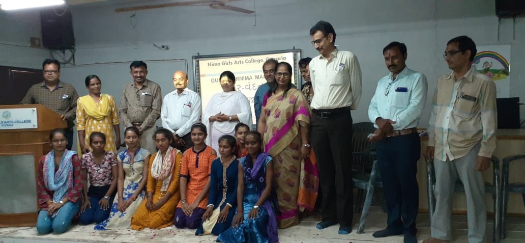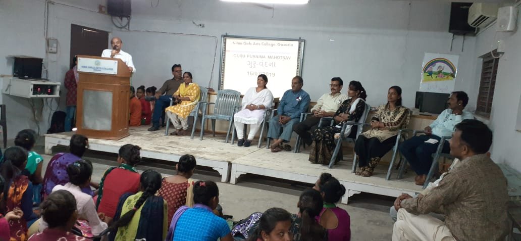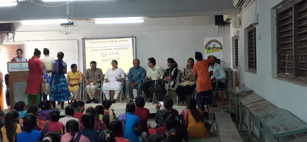 As part of Knowledge bend of NGAC, Gozaria on July 16, 2019 a festival of Guru Purnima was held in Nima Girls arts College, Gozaria, in which the girl-students carried out auspicious ‘Kumkum tilak’ on foreheads of their teachers and rendered them the symbolic presents of pens and roses. This programme was anchored by the girl-students of the college. The campus director Mr Patel and the in-charge principal of the college DR Barot appreciated this programme contributed by the girl-students only. A cultural programme of singing songs and soliloquies was also carried out by the gir-students. At the very close of the programme DR. Tushar expressed an encouraging vote of thanks.