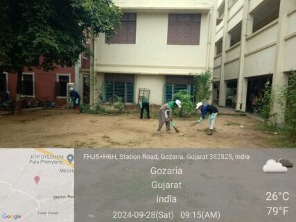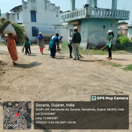On September 30, 2024 the volunteers of the unit carried out cleanliness I the surroundings of the ‘Veer-bhoomi’ near the, village pond called ‘Amrut-sarovar’. Enthusiastic leader of the village and the taluka delegate Mr. Mihirbhai Patel was invited to open up the programme near the village pond. He appreciated the unit for selecting an appropriate place for carrying out the task. After the completion of cleanliness at the Martyars’ Chowk, the girls- 48 in number carried out the activities of cleanliness at in the precincts of the Swaminarayan and Sai Temples, Gozaria.